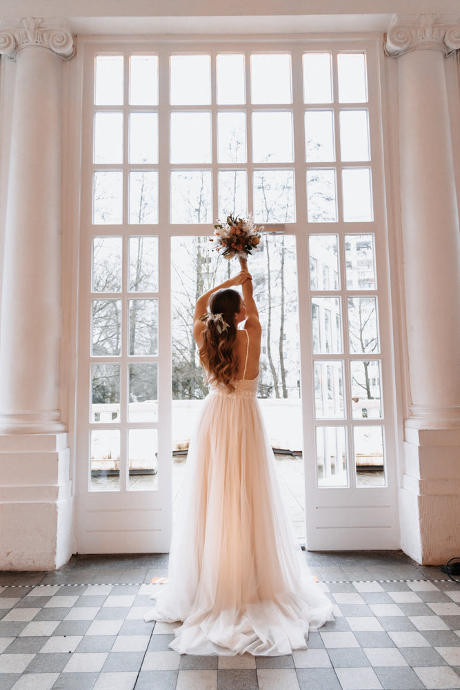 Dieses wundervolle Brautkleid im Boho-Style lässt Träume in Wirklichkeit verwandeln. Es besteht aus einem weichen Soft-Tüllstoff, welcher sehr leicht und fließend fällt. Das Dekolleté ist hinreißend, ebenso wie die verspielten Details sowie der tiefe Rückenausschnitt und die dezente Schleppe.